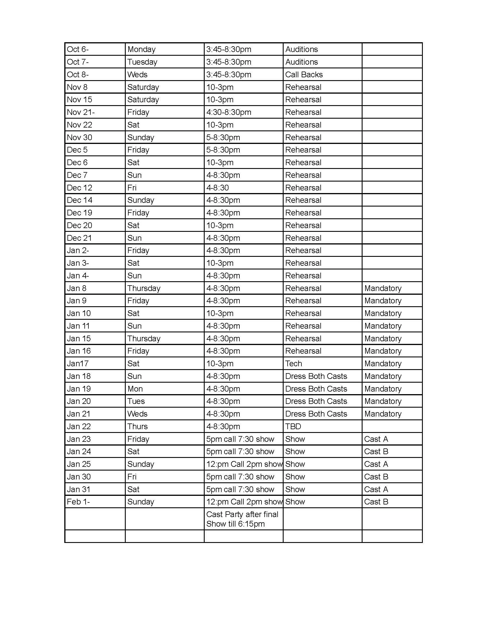 Please look at the schedule. If you have more than two outdates, you will not be considered for a lead role.